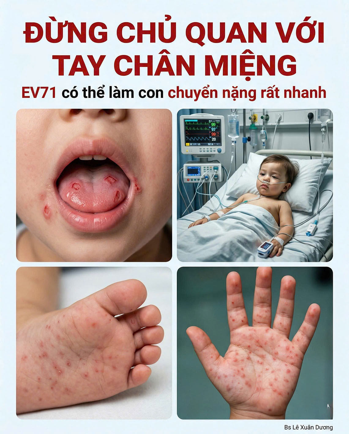 - EV71 vì sao làm ba mẹ phải cảnh giác hơn? Không phải chủng nào gây tay chân miệng cũng giống nhau. Nhiều ca nhẹ là do các chủng virus khác, nhưng EV71 đáng ngại hơn vì nó có thể tấn công hệ thần kinh trung ương, gây các biến chứng như viêm não, viêm màng não, phù phổi thần kinh, suy hô hấp và làm bệnh chuyển nặng nhanh hơn nhiều.