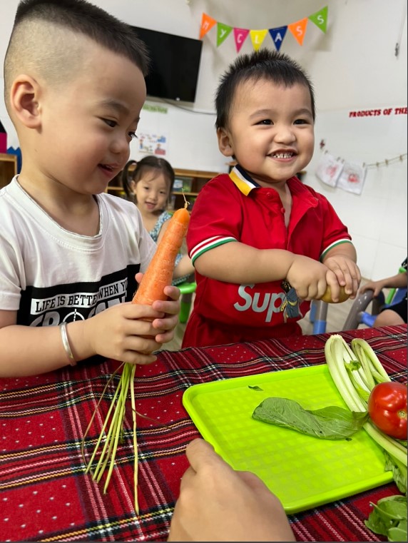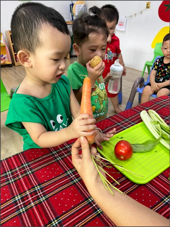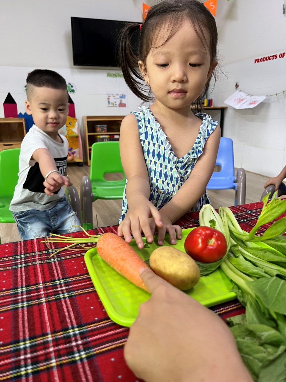 Hôm nay, các bạn nhỏ lớp Pigeon tham gia một hoạt động về chủ đề nhận biết rau củ quả.