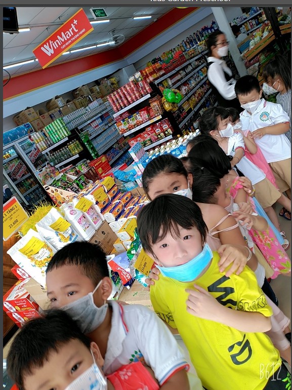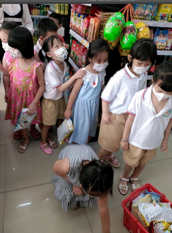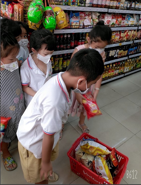 Trong quá trình tham quan và mua sắm cô đã khéo léo lồng ghép hướng dẫn cho các bé những kỹ năng cơ bản khi đi siêu thị như: kỹ năng xếp hàng không chen lấn xô đẩy khi vào siêu thị, biết lựa chọn sản phẩm cần thiết và đặc biệt kỹ năng ứng xử chào hỏi nơi công cộng, biết tính tiền và chờ đến lượt mình, biết cám ơn và chia sẻ những món đồ vừa mua cùng bạn.
