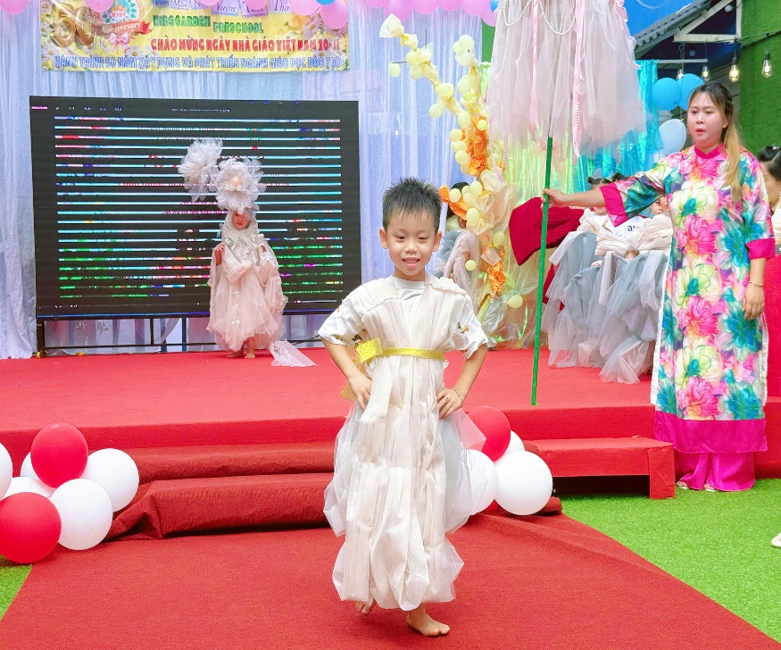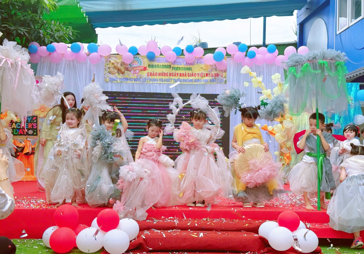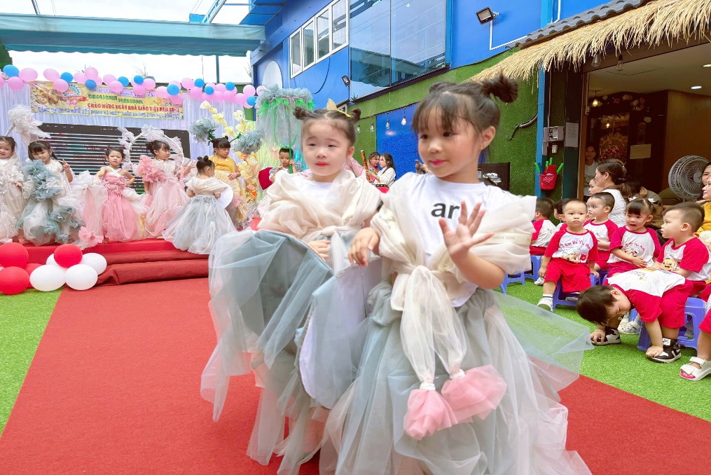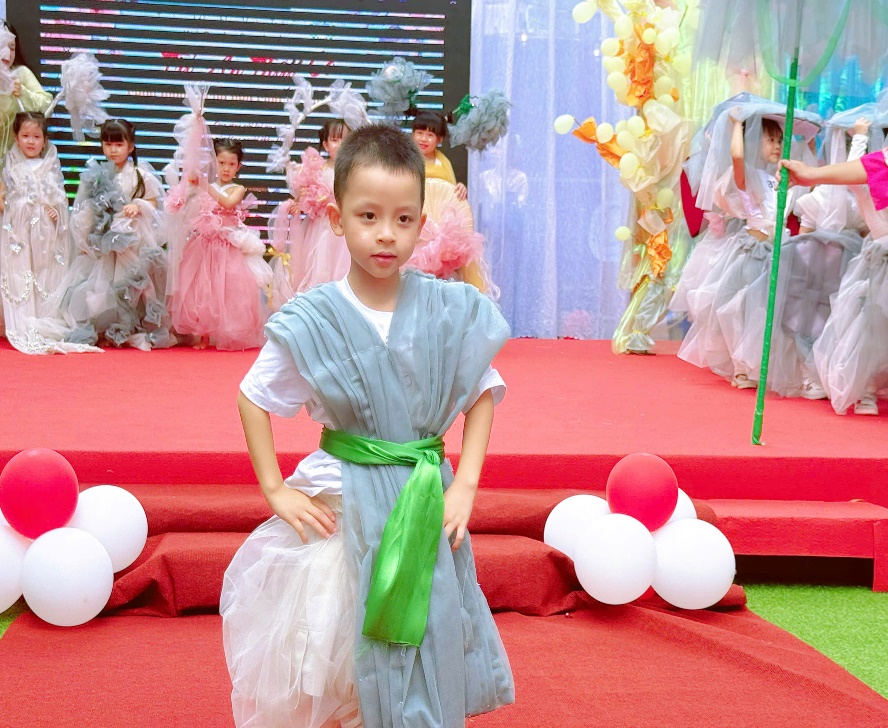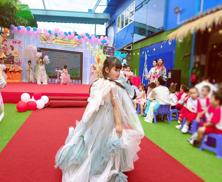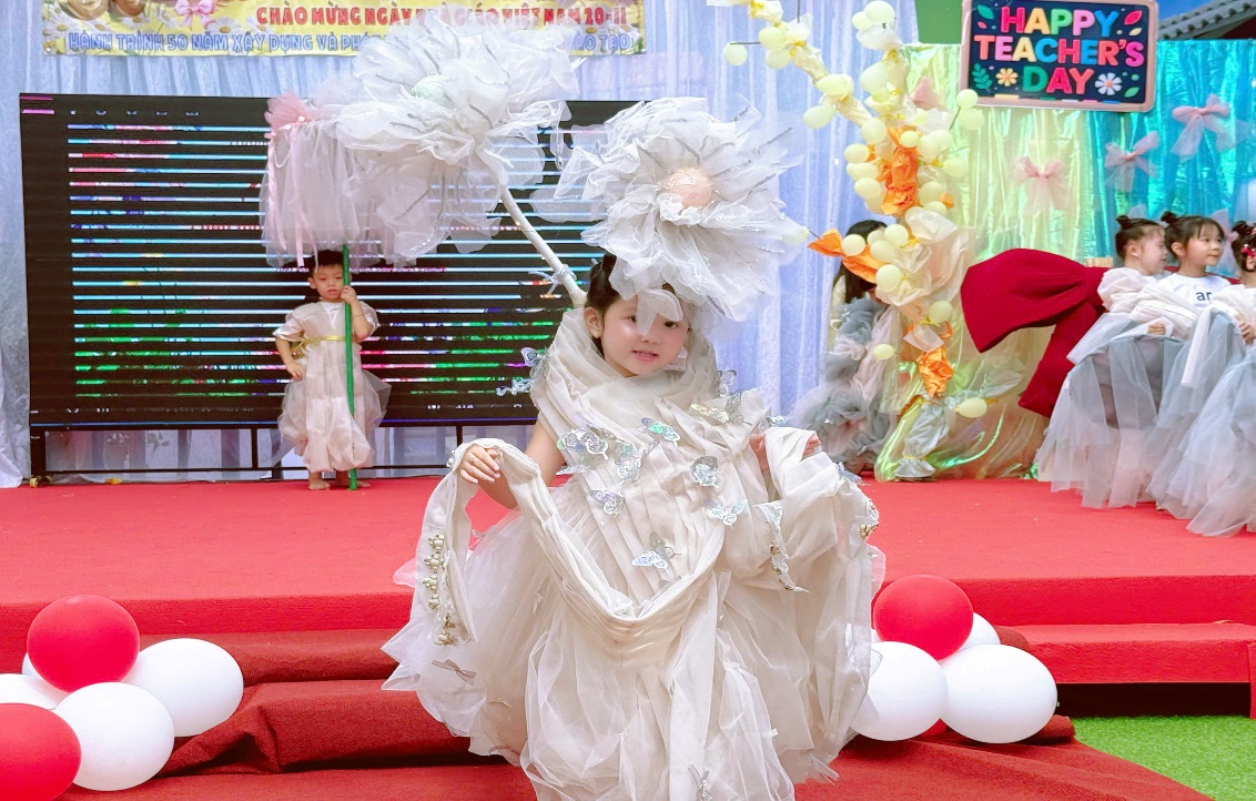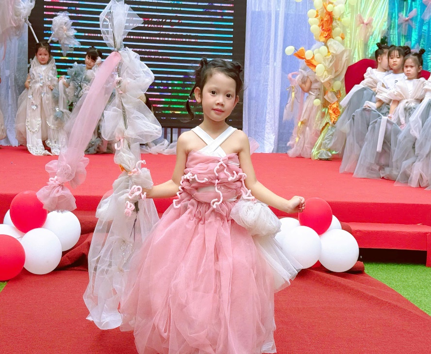 Điều đặc biệt nhất của chương trình năm nay chính là toàn bộ trang phục đều được làm thủ công, từ những vật liệu thân thiện như vải voan, giấy mỹ thuật, dây ruy băng, hoa trang trí… Với sự hỗ trợ của giáo viên, mỗi bé đều được tự chọn màu sắc, kiểu dáng và chi tiết trang trí theo sở thích của mình. Mỗi bộ trang phục vì thế mang một dấu ấn thật riêng – vừa hồn nhiên, vừa sáng tạo đúng chất tuổi thơ.